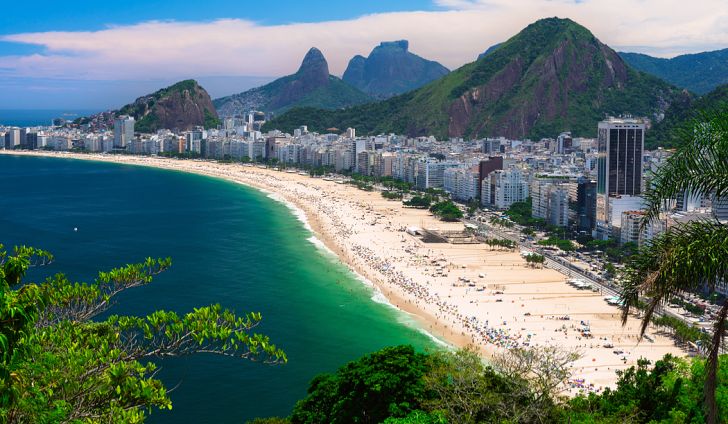 <Bãi biển Copacabana, Rio de Janeiro, Brazil. Là quốc gia lớn nhất ở Nam Mỹ với hơn 8,51 triệu km2, Brazil là nơi có nhiều khu rừng nhiệt đới lớn nhất thế giới, Amazon. Amazon rất dày đặc và rộng lớn đến nỗi các nhà thám hiểm và nhà khoa học đã tìm thấy những nền văn minh của loài người chưa bao giờ tiếp xúc với thế giới bên ngoài.Brazil cũng có một bờ biển Đại Tây Dương dài ở phía đông, trải dài khoảng 8.000 km. Hầu hết các thành phố lớn của nó, bao gồm Rio de Janeiro và São Paulo, tồn tại gần bờ biển.