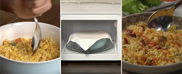 7. Làm mềm cơm thừa để lạnh Cơm thừa để trong tủ lạnh vừa cứng vừa khô, hãy phủ một lớp khăn ẩm lên mặt tô rồi làm nóng bằng lò vi sóng khoảng 1-3 phút, cơm sẽ thơm mềm trở lại. Cơm bị cứng có thể phủ một lớp giấy lên mặt rồi làm nóng bằng lò vi sóng.