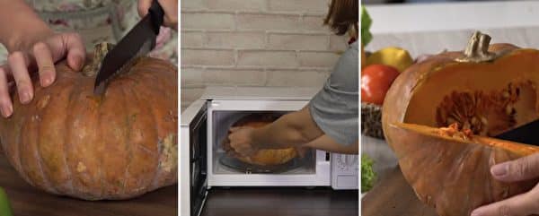 2. Cắt bí đỏ Bí đỏ rất cứng, rất khó cắt, nhất là những quả bí to quá cỡ. Lò vi sóng có thể giúp bạn được điều này. Đầu tiên, hãy để phần bên trong quả bí đỏ được thông khí (ví dụ như đục lỗ trên vỏ) nhằm tránh bị nổ khi làm nóng; sau đó cho bí đỏ vào lò vi sóng và làm nóng một lúc, khi lấy ra sẽ rất dễ cắt, vỏ cũng dễ gọt hơn. Bí đỏ rất khó cắt, sau khi làm nóng bằng lò vi sóng sẽ có thể cắt được ngay, vỏ cũng rất mềm.